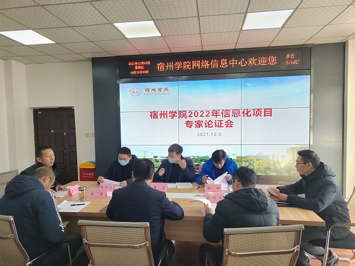 12月3日下午,我校2022年信息化建设项目专家论证会在逸夫楼B102会议室举行。会议邀请了淮北师范大学信息中心主任曹磊、安徽财经大学信息中心主任闻帅、宿州市工业投资集团副总杨宝生三位校外专家。我校招生就业处处长杨刚、团委书记凌峰、信息工程学院党委主要负责人余晓永等校内专家参与论证,办公室网络与信息技术中心相关人员参加了会议,会议由办公室副主任张万礼主持。